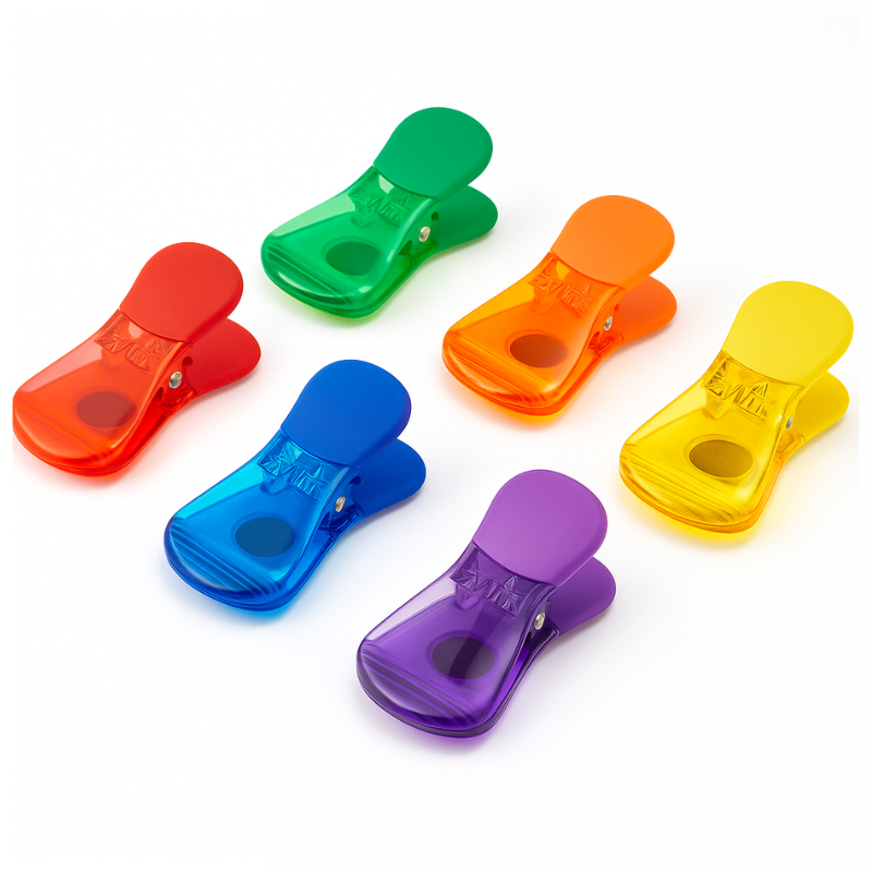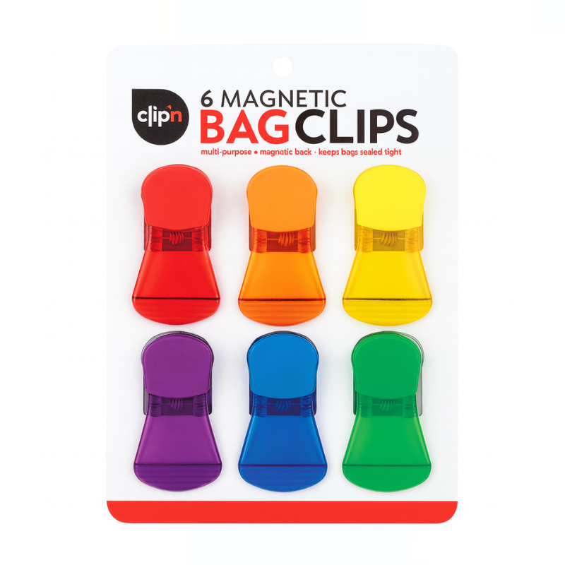 Son los aliados perfectos para sellar bolsas y mantener el orden de tu hogar. Están fabricados con plástico ABS transparente, tienen muelle de acero y un imán incorporado, para que puedas colocarlos en la heladera o en un pizarrón metálico y sujetar notas.