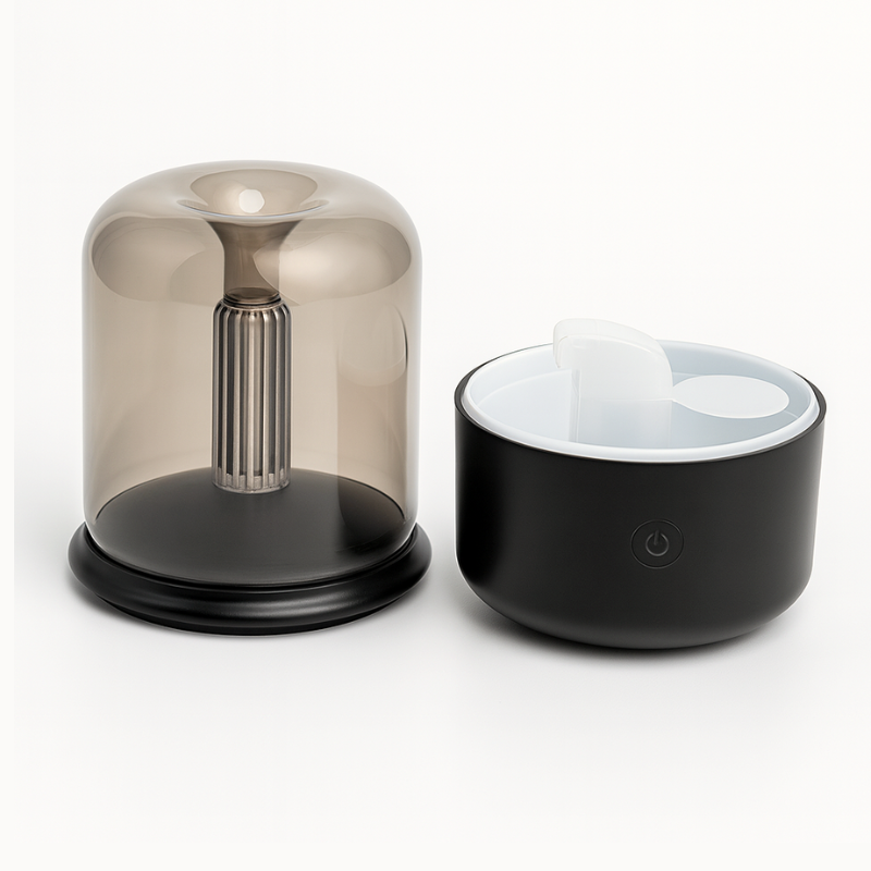 Fabricado en plástico de alta resistencia su diseño retro evoca las antiguas lámparas de filamento. Tiene un sistema ultrasónico que transforma el agua y aceites esenciales en una bruma fina sin usar calor. Se puede ajustar la intensidad de la niebla y la luz . El equipo se apaga automáticamente cuando el nivel de agua es bajo.