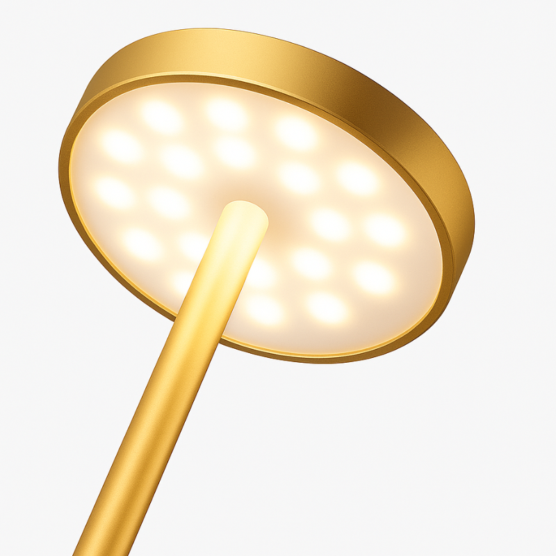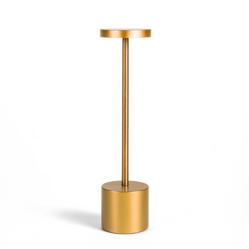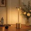 Su diseño delgado y elegante está inspirado en la opulencia de la lampara T. Tiene un cuerpo de aluminio con acabado metalizado y LED integrado. Funciona con batería recargable por USB y su duración es de hasta 12 horas. El sensor táctil ajusta tres niveles de brillo, emitiendo una luz suave y sin parpadeos. Es ideal para cenas íntimas, terrazas o cualquier rincón al que quieras darle un toque romántico.