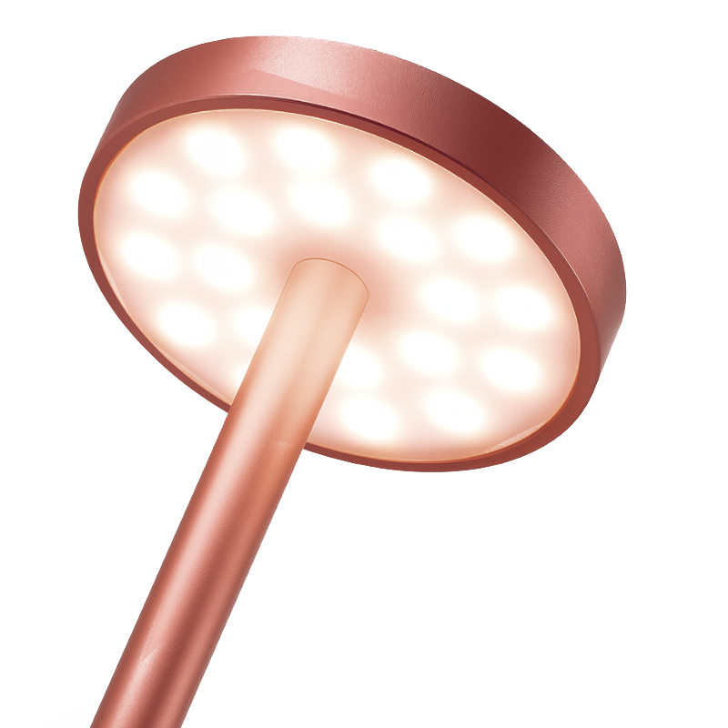 Su diseño delgado y elegante está inspirado en la opulencia de la lampara T. Tiene un cuerpo de aluminio con acabado metalizado y LED integrado. Funciona con batería recargable por USB y su duración es de hasta 12 horas. El sensor táctil ajusta tres niveles de brillo, emitiendo una luz suave y sin parpadeos. Es ideal para cenas íntimas, terrazas o cualquier rincón al que quieras darle un toque romántico.