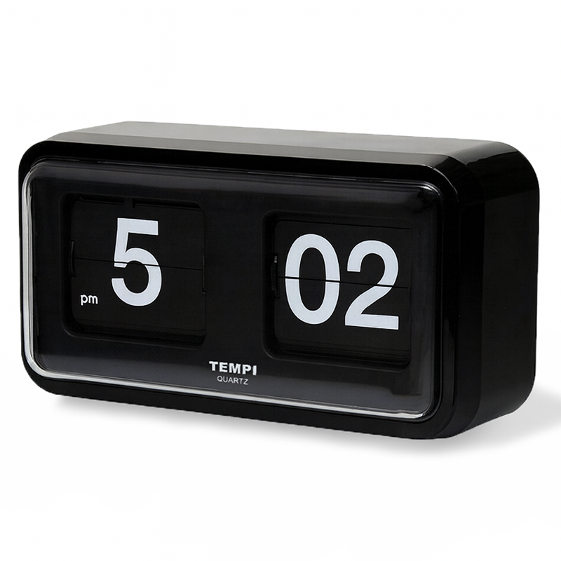 Su sofisticado sistema de tarjetas se voltean cada minuto y marcan la hora en formato am/pm. La carcasa está fabricada en plástico ABS brillantes moldeado con una cubierta de acrílico transparente. Sus grandes números blancos sobre fondo negro ofrece una lectura clara y rápida. Un diseño que se destaca por su funcion y belleza.